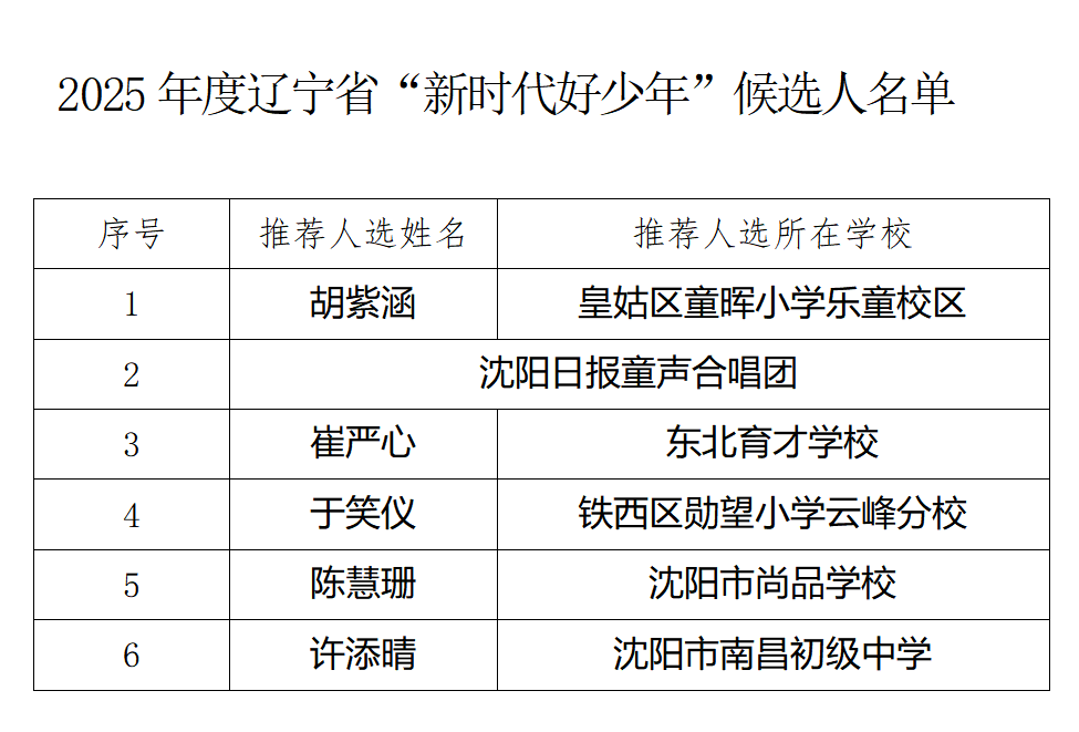 按照《关于开展2025年辽宁省“新时代好少年”宣传学习活动的通知》要求,市精神文明办、市教育局、团市委、市妇联、市关工委面向全市未成年人开展了“新时代好少年”学习宣传活动,在严格把关、层层推荐的基础上,产生2025年度辽宁省“新时代好少年”候选人6名,现将候选人名单予以公示(名单附后),接受社会监督。公示时间从即日起至9月30日,如对人选有异议,请于公示期内向市委宣传部文明培育处反映。联系电话:024-22845860。