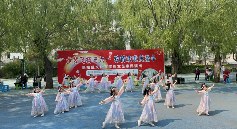 5月22日下午,三台子街道梅江东社区新时代文明实践站在社区广场组织了一场以“童梦飞扬迎六一,粽情欢歌庆端午”为主题的皇姑区文化宣传周文艺惠民演出。